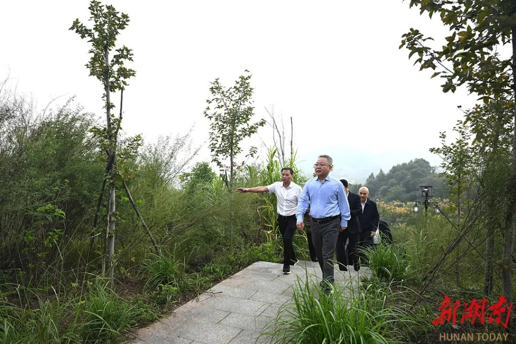 ▲10月9日,沈晓明在水口山铅锌煤矿区山水林田湖草生态保护修复项目刘家湾生态园调研。