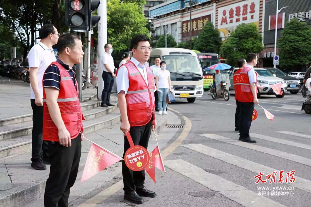 来到五一路与蔡伦路十字路口,赖馨正穿上红马甲,站在路口与“衡阳群众”耒阳志愿者一同进行交通劝导。他叮嘱大家要坚守岗位,认真负责开展文明劝导,引导广大市民自觉参与到文明行动中来,让文明成为习惯,使井然成为常态。