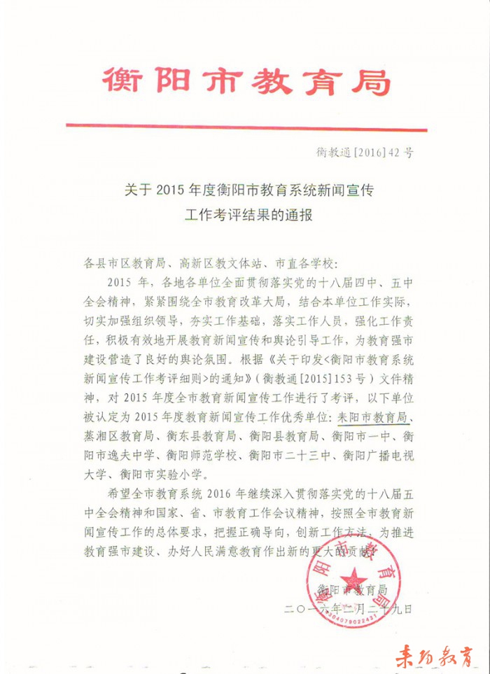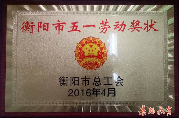 2016年4月28日,在衡阳市总工会召开的庆祝“五一国际劳动节”表彰大会上,市教育局荣获衡阳市“五一劳动奖状”。