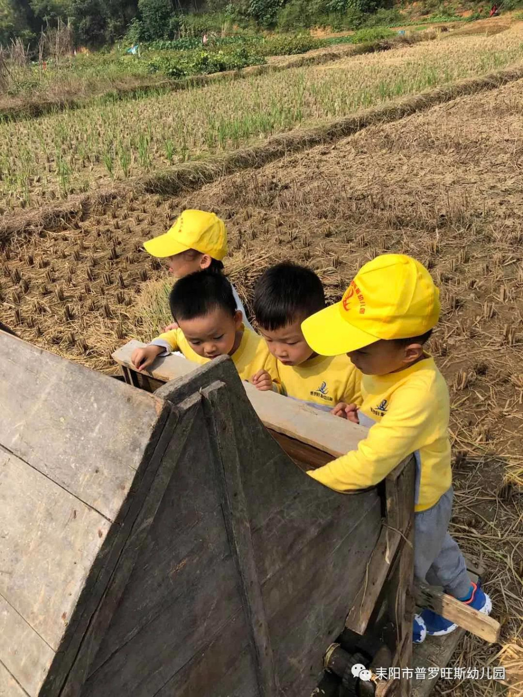 在去稻田之前,老师教孩子们认识了各种收稻谷工具、稻谷生长过程等。