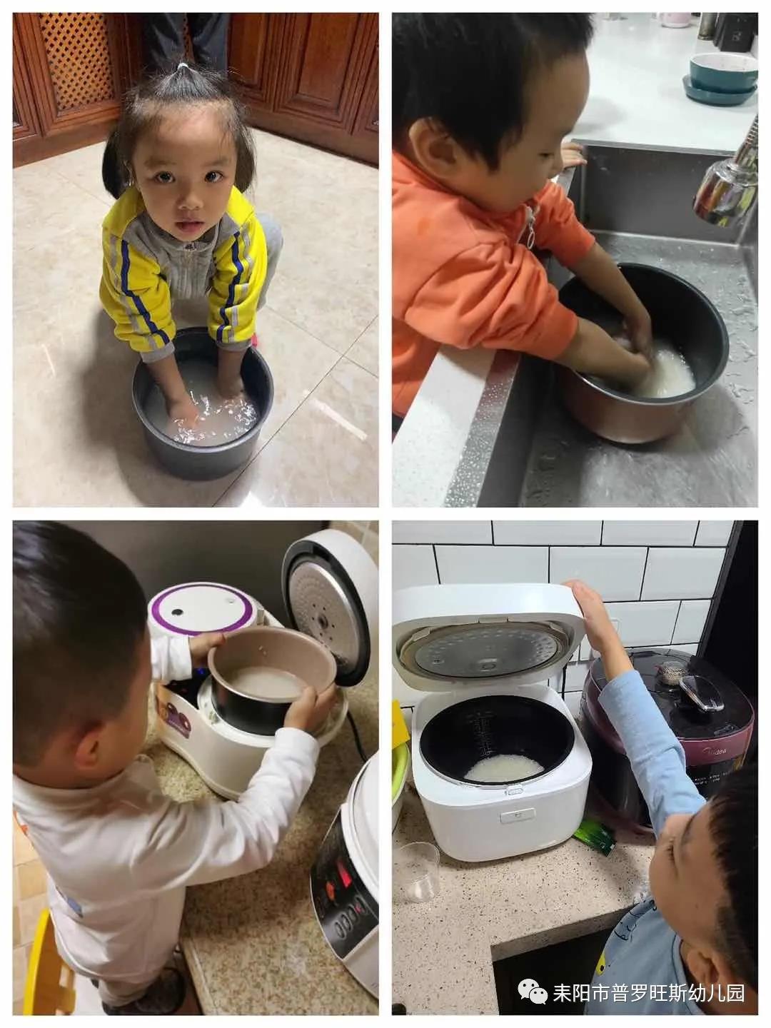 回家后,孩子们在家尝试淘米煮饭。