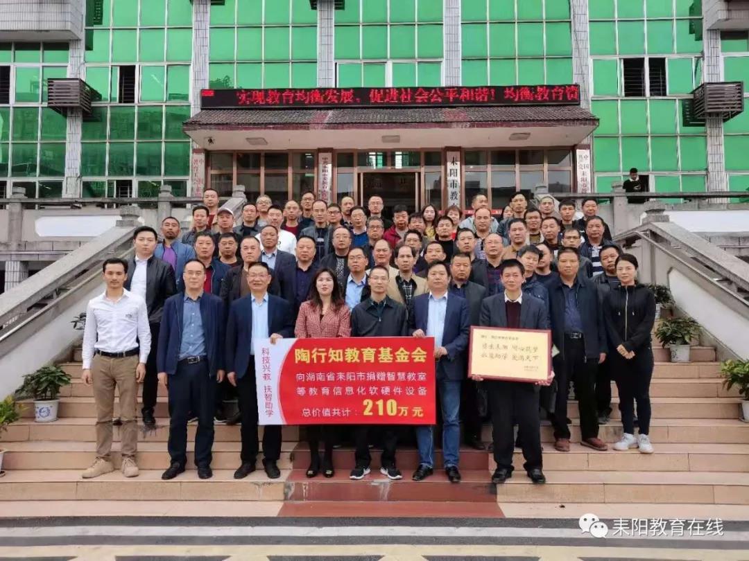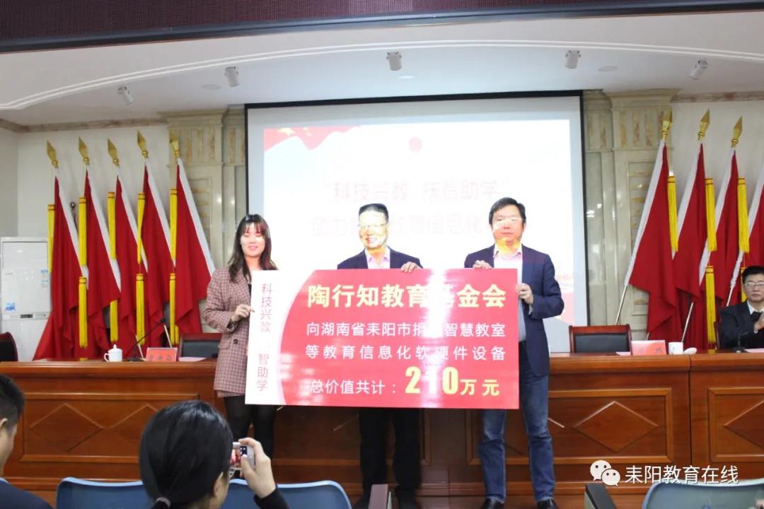 11月20日,陶行知教育基金会“科技兴教 扶智助学”助力城乡教育均衡发展公益捐赠启动仪式在市教育局四楼举行,副市长王翔,教育局党委副书记、副局长曹寿昌,教育局主任科员(正科实职)干部朱文锦,陶行知教育基金会公益基金管委会秘书长周鹏,智慧课堂项目组湖南省负责人何智利出席活动,63所受捐赠的学校相关负责人及教育局相关股室负责人共同见证。
