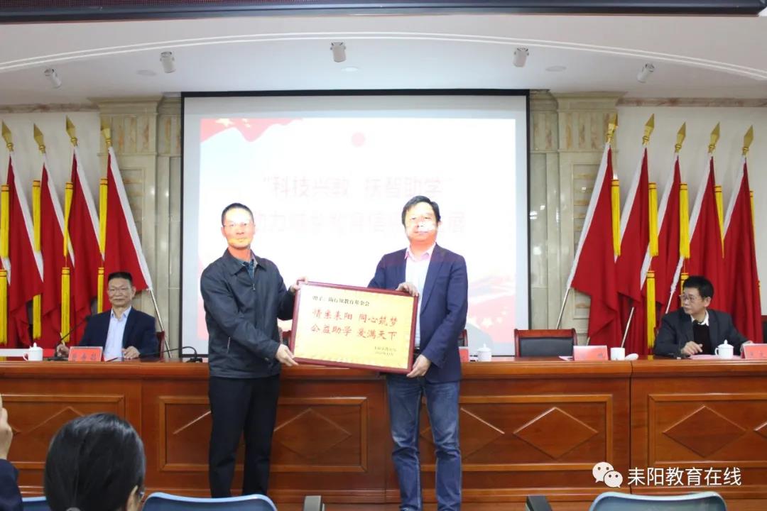 会上,陶行知教育基金会向全市63所学校捐赠了信息化教学设备210万元(kt牌),曹寿昌代表教育局接受捐赠,王翔向陶行知教育基金会赠送铜牌表示感谢。
