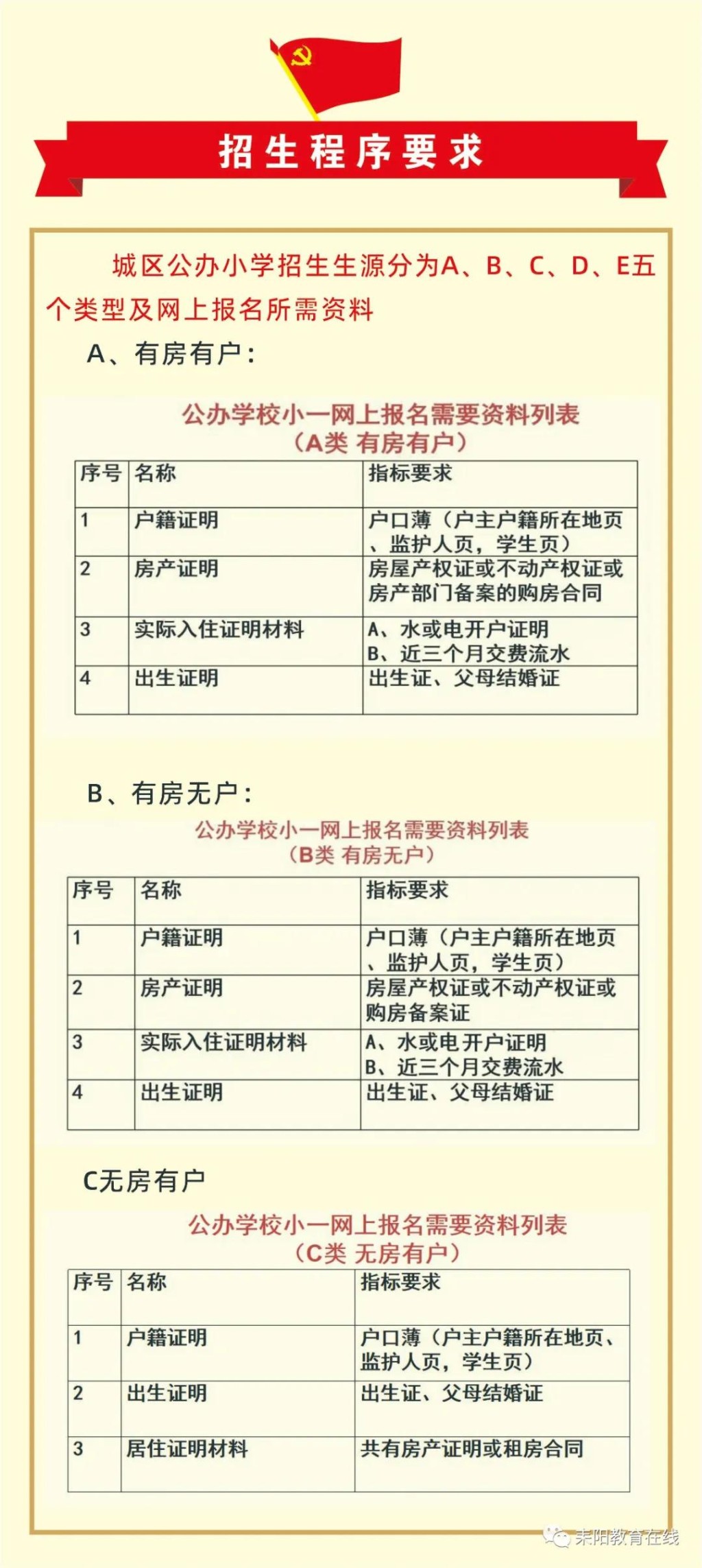 小学:“房户一致”优先,然后按“有房无户、有户无房、无房无户Ⅰ类(小产权房)、无房无户Ⅱ类(租房)”5类型排序注册入学;未被录取的学生通过统筹调剂的方式入学。初中:九年(十二年)一贯制小学毕业生优先直升本校初中部;其它小学划定对口升学初中学校。若招生学校学位不够,则通过随机派位方式确定录取名单,未被录取的学生通过统筹调剂的方式入学。继续严格实行公、民办义务教育学校同步招生政策,按照“计划到校、免试入学、超员摇号”的方式进行。一是城区公民办学校严格实施同步、同时、同平台招生,民办学校不再接收学生报名;二是严格实行“超员摇号”,若申请学位人数少于学校招生计划数,则全部录取;若申请学位人数多于学校招生计划数,则通过随机派位方式确定录取名单。