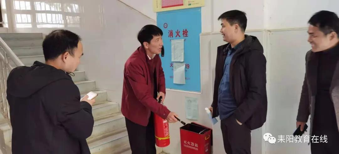 1月15日,星期六,教育局党委书记、局长张小勇来到武广高级中学督导校园安全工作,张小勇对学校的校容校貌、基础设施特别是安全设施设备进行了检查,还亲自动手检查了学校楼道的消防设施,对消防栓的出水量、灭火器的阀门等仔细进行了调试。
