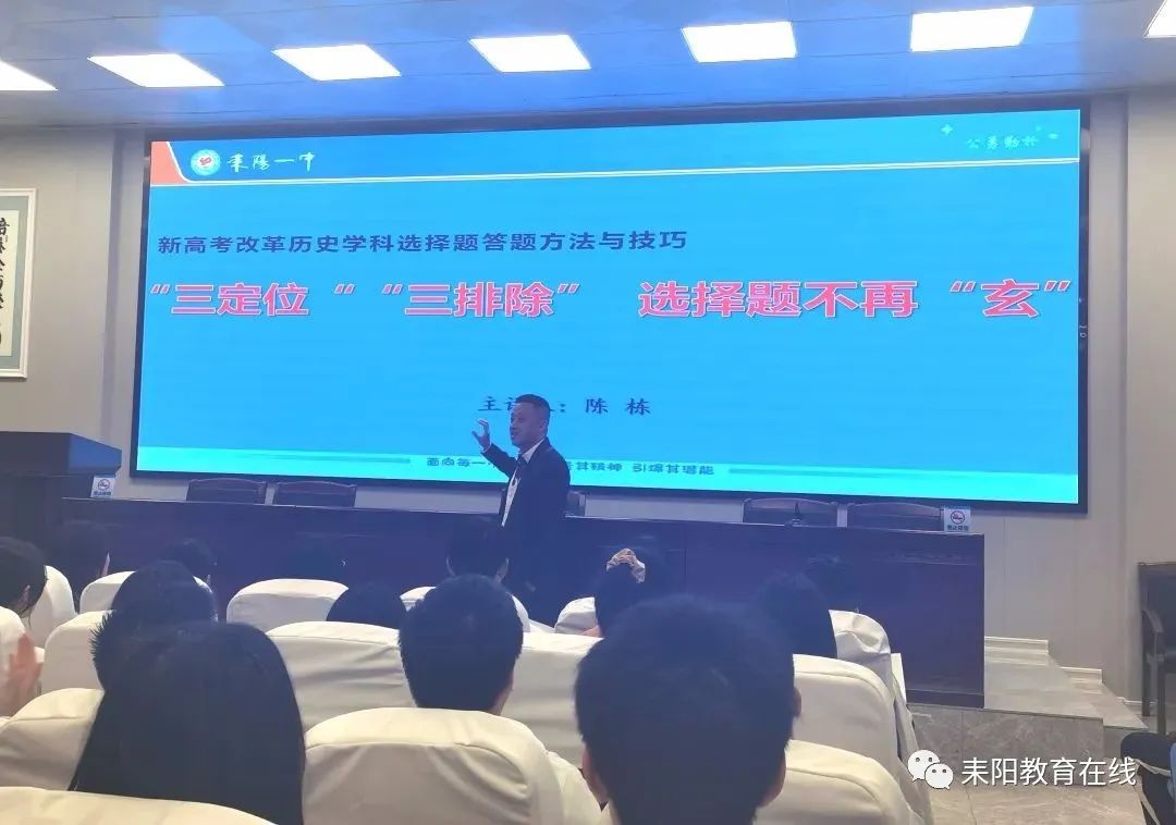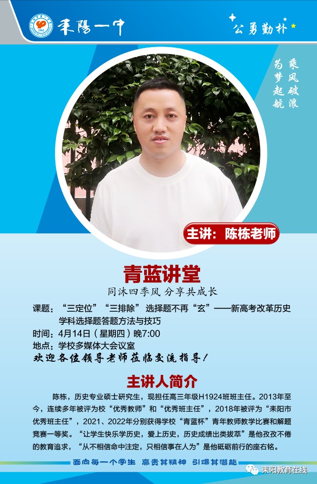 4月14日晚,耒阳一中在学校多媒体大会议室举办了首期“青蓝讲堂”活动,学校历史组全体教师、其他学科部分教师和高三年级历史科学生参加活动。本次活动由教师发展处负责人主持。