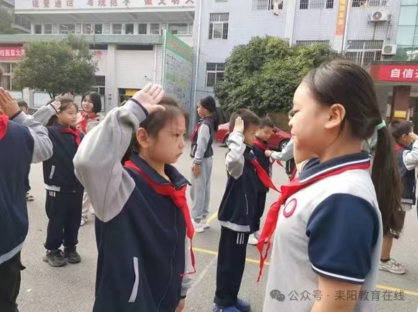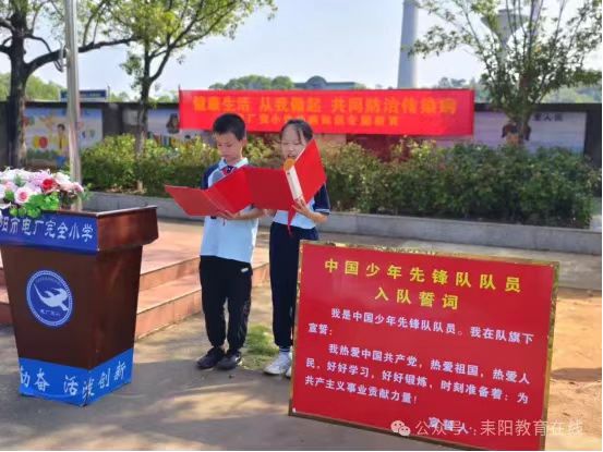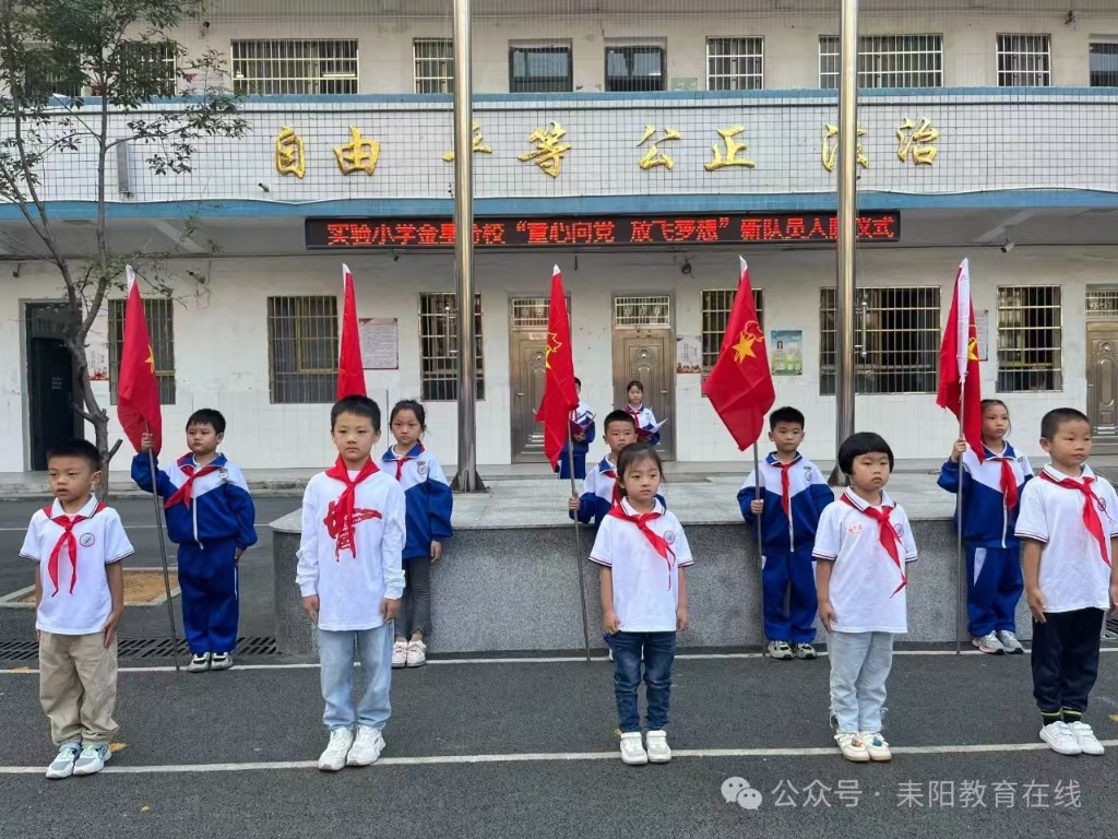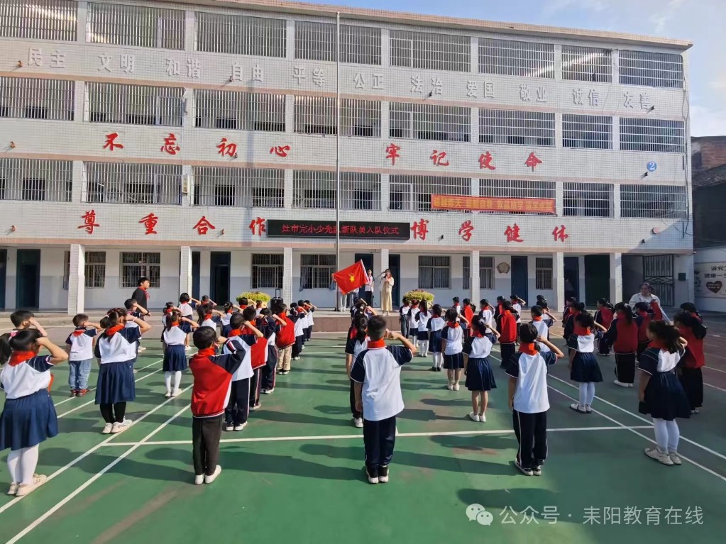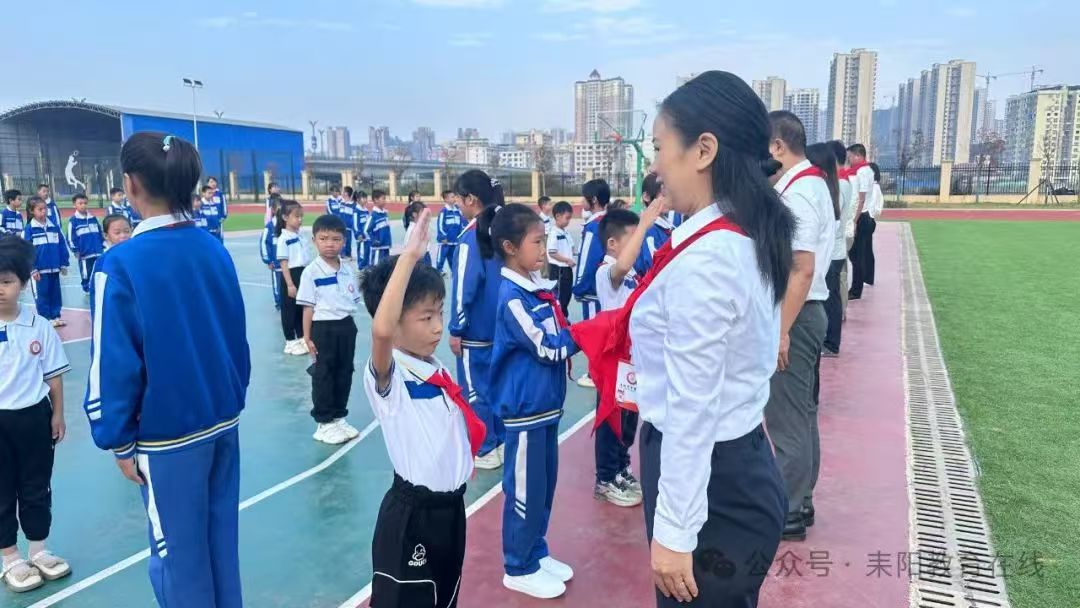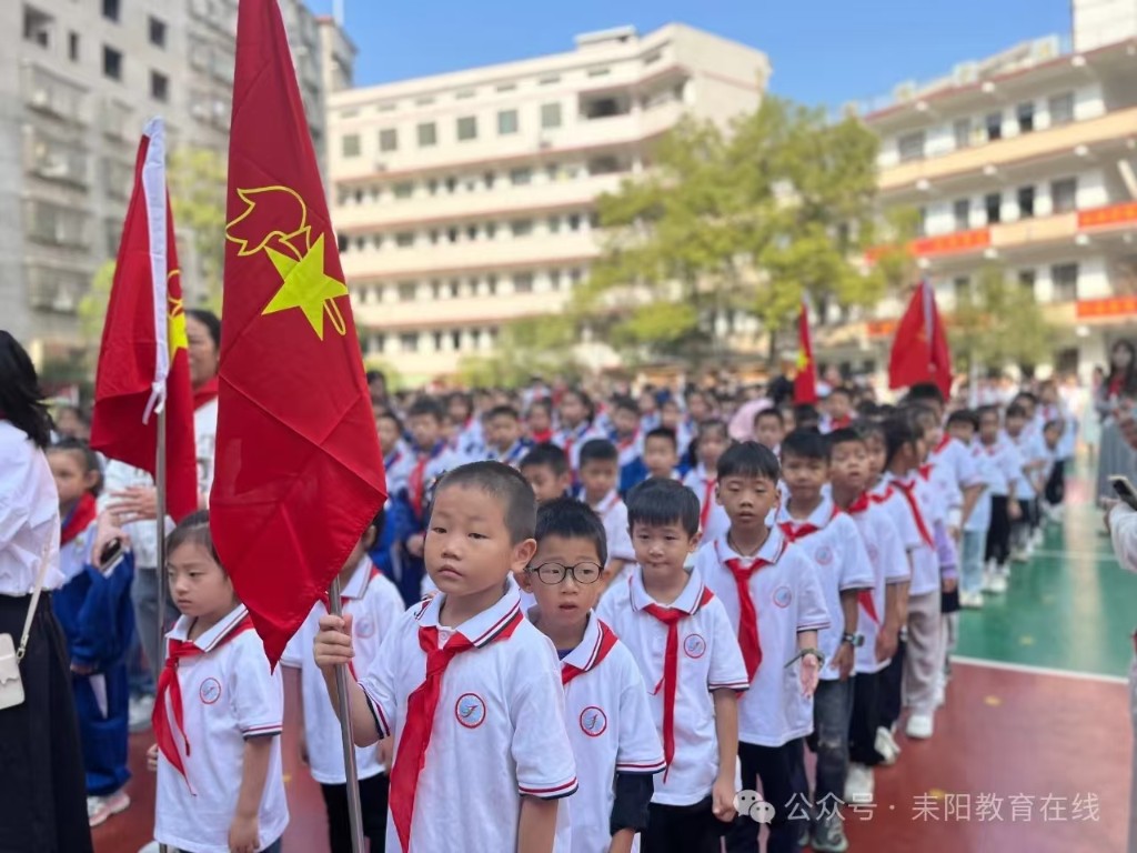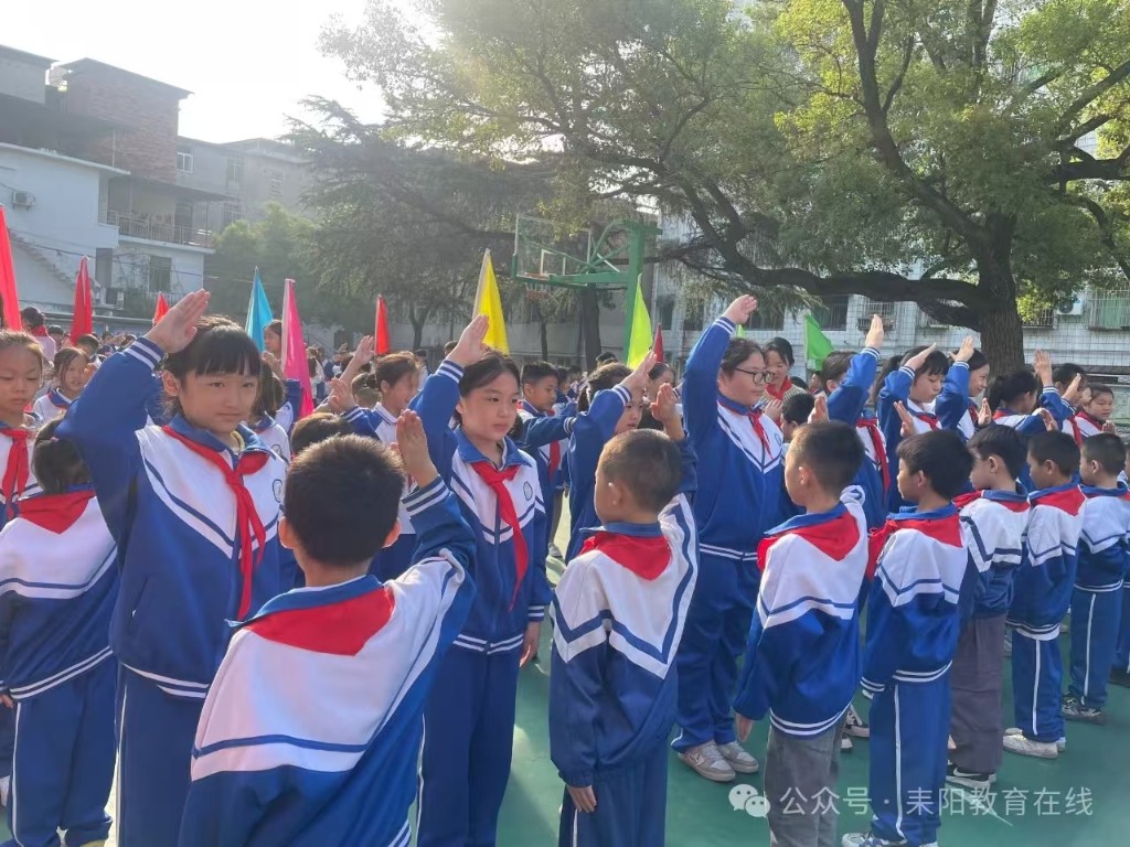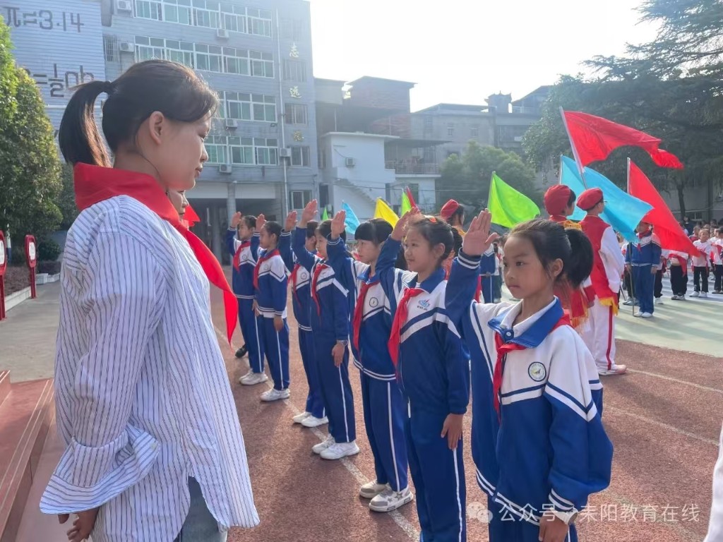 该校主要负责人发表致辞,对新队员表示祝贺,并寄予殷切期望,希望队员们在少先队组织中茁壮成长,努力成为有理想、有道德、有文化、有纪律的社会主义建设者和接班人。在辅导员的带领下,全体队员呼号,表达为共产主义事业奋斗的决心。(通讯员 蒋丽)星星火炬,闪耀征程——前进小学举行2024年新少先队员入队仪式“今天,我也要成为一名光荣的少先队员啦!”“我真想快点把红领巾系在胸前,这样我就能向国旗敬队礼啦!”10月12日,耒阳市前进小学举行庆祝中国少年先锋队建队75周年暨新队员入队仪式。