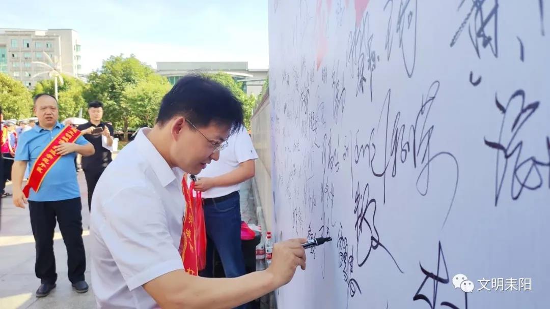 启动仪式前,参加整治行动的全体人员先后在签名墙上签下姓名,进一步坚定开展好发明家广场文明示范片区综合整治行动的信心决心。随后,出席启动仪式的县级领导、城管局、综合行政执法局、交警大队骑警、五里牌街道、衡阳群众等140余人组成方队,沿着市委广场、西湖路、金星路、体育路、金阳路、西湖路、文体会议中心步行开展集中游行宣传,进一步加大“创文”宣传力度,动员广大人民群众积极投身文明城市创建,推进省级文明城市创建工作再上新台阶。(记者 钟杰 李双鸿)