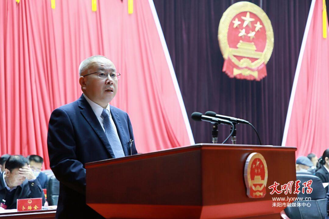 在热烈的掌声中,市委副书记、市长尹立鑫代表市人民政府向大会作《政府工作报告》。报告分为“回顾本届政府工作,我们聚力全面小康,经济社会发展迈上新台阶”“展望新一届政府工作,我们对标‘五个耒阳’,奋力书写高质量发展新篇章”“踏上新的赶考之路,我们坚决自我革命,为建设现代化耒阳展现新作为”三个部分。