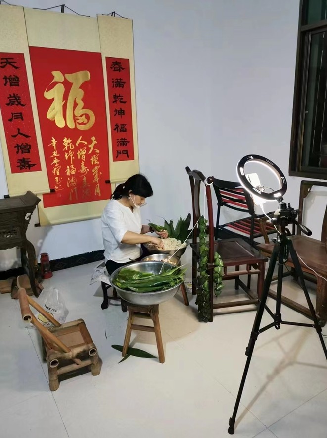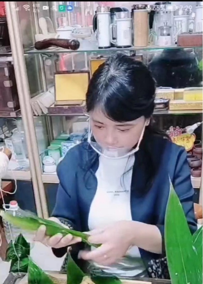 看菜吃饭,量体裁衣。肖菊花说,自己不像年轻人,拥有青春靓丽的外貌优势,她只能以诚信和品质取胜。作为一个嗜好传统美食的家庭主妇,她练就了制作美味佳肴的手艺,什么腌咸菜、包粽子、酿米酒、做麻饼等等,都是她的拿手好戏,于是她便从制作美味起步直播。万事开头难,她常常直播几个小时,累得唇焦口燥、腰酸背痛,在线的粉丝还不到10人。伍老师鼓励她说:“只要坚持,千辛变万果。”学校和老师的支持,让她信心百倍。她认真播好每一场,有时为了一个视频,鼓捣几个小时也不言弃。有一次直播煎黄腌蛋,为了追求逼真效果,她一边剥洗黄泥巴包裹的盐蛋,一边热油,料酒味、腌渍味、油烟味,直熏得她眼睛冒烟、口干舌燥。功夫不负有心人,直播两个月后,她的原生态传统美食系列,赢得了观众的青睐,销量不断增加。一次青粑直播,就卖了1000多个。端午前做粽子直播,八百多斤糯米粽子卖了个精光。有个广东的微信好友,平时也没怎么聊天,但是她直接用微信转来2000元买粽子,让肖菊花感到非常惊喜,心里洋溢着满满的获得感。
