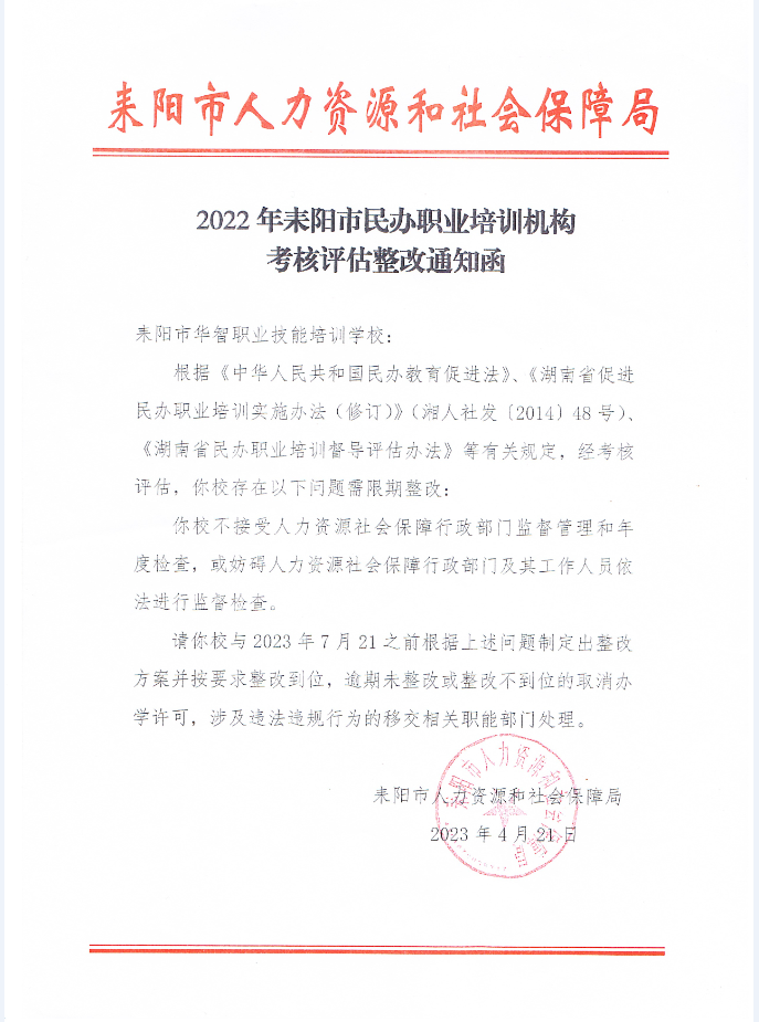 2022年耒阳市民办职业培训机构考核评估整改通知函