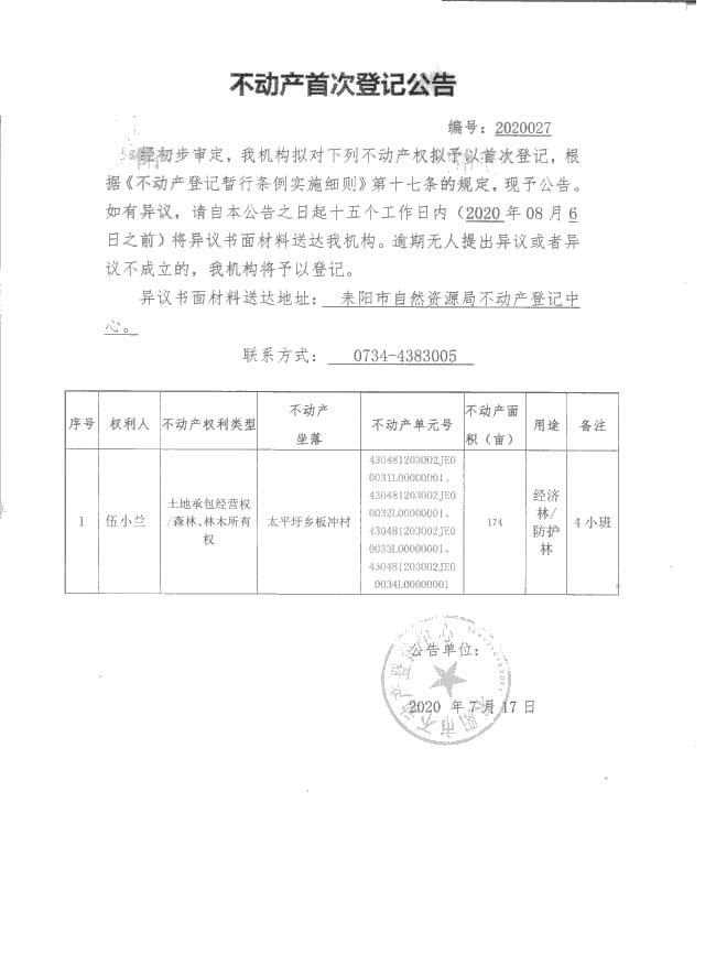 不动产首次登记公告(2020027)