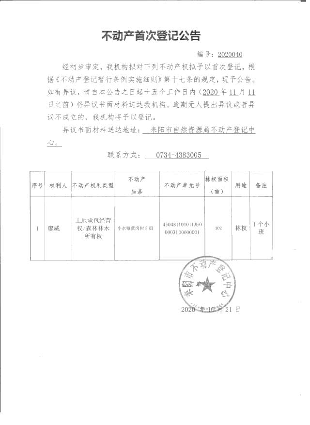 不动产首次登记公告(2020040)