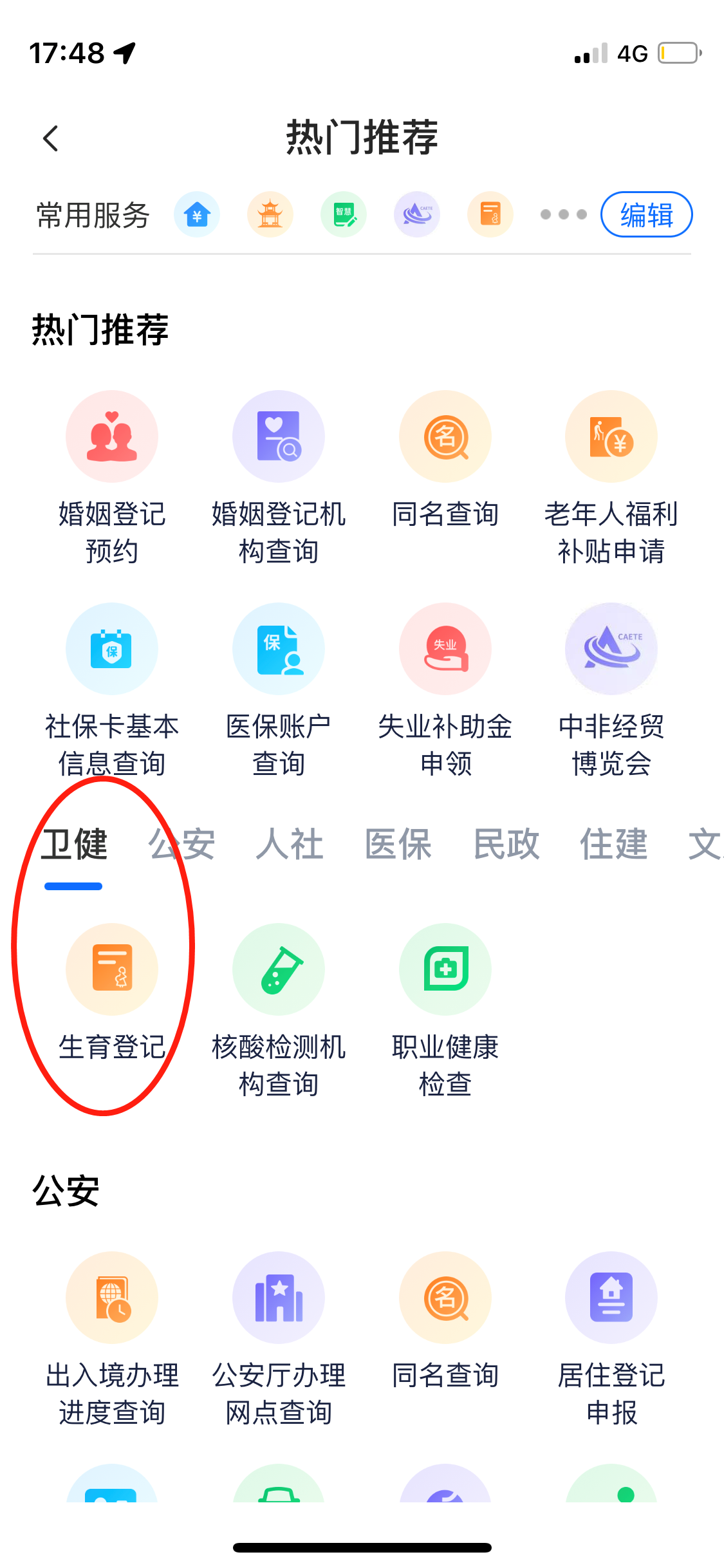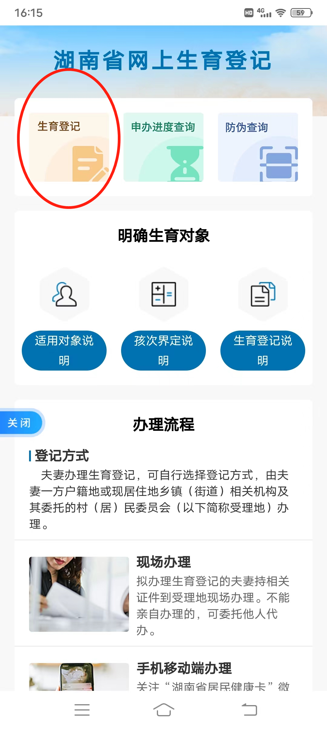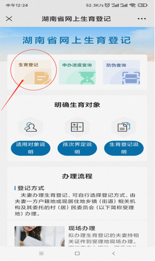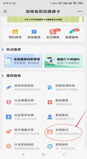 一、手机移动端办理。关注"湖南省居民健康卡"微信公众号,在便民服务中查找"生育登记",点击进入,按提示办理。