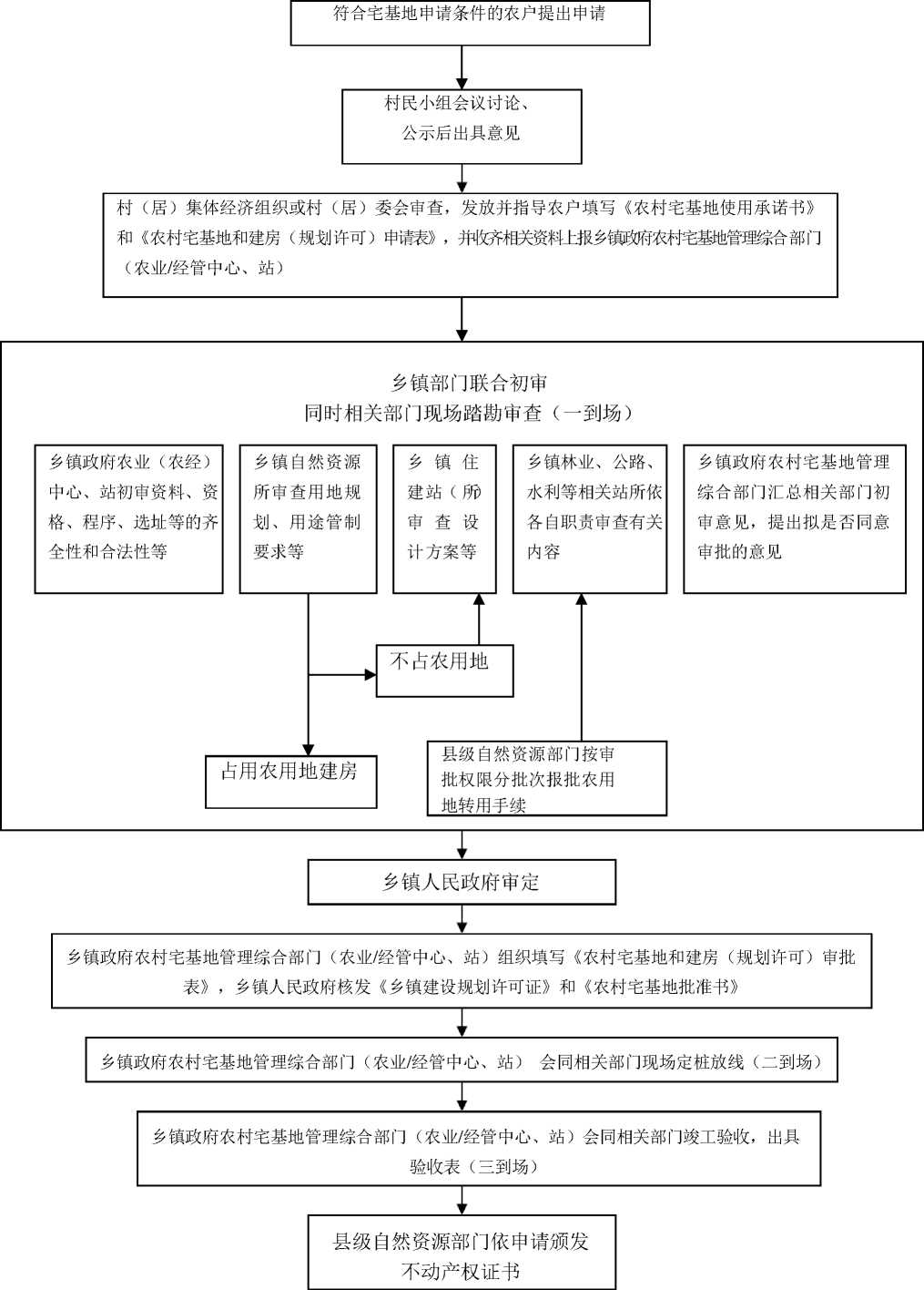 (三)依法规范宅基地审批和建房规划许可管理。各部门要依法履行职责,进一步规范农村宅基地审批和建房规划许可管理工作。一是依法履行审批权。按照新修订的《中华人民共和国土地管理法》规定,农村村民住宅用地由乡镇人民政府审核批准。乡镇人民政府为农村村民建房审批、监管第一责任单位,具体负责农村住房建设的管理、监督和服务工作。根据法律法规授权以及县级人民政府有关主管部门的委托,实施村民住房建设的行政审批和综合执法。二是规范审批程序。按照"村民申请,村委初审,乡镇联审、县级备案"的程序,符合宅基地申请条件的农户,以户为单位向所在村民小组提出宅基地和建房(规划许可)书面申请,村民小组收到申请后,应提交村民小组会议讨论,并将申请理由、拟用地位置和面积、拟建房层髙和面积等情况在本小组范围内公示。公示无异议或异议不成立的,村民小组将农户申请表和承诺书、村民小组会议记录等材料交村级组织进行初审。村级组织重点审查提交的材料是否真实有效、拟用地建房是否符合村庄规划、是否征求了用地建房相邻权利人意见等。审查通过的,由村级组织签署意见,报送乡镇政府进行联审。没有分设村民小组或宅基地和建房申请等事项已统一由村级组织办理的,农户直接向村级组织提出申请,经村民代表会议讨论通过并在本集体经济组织范围内公示后,由村级组织签署意见,报送乡镇政府进行联审。乡镇联审中,乡镇农业综合服务中心(农村经营管理部门)负责审核申请人是否符合建房资格、拟用地是否符合宅基地布局要求和面积标准、宅基地和建房(规划许可)申请是否经过村组审核公示等,并综合各有关部门意见提出审核建议。自然资源所负责审核是否符合村庄规划、用途管控要求等,其中涉及占用农用地的,应在办理农用地转用审批手续后,办理乡村建设规划许可手续。住房和城乡建设服务所负责审核设计方案等;涉及林业、公路、水利、电力、燃气等部门单位的及时征求意见。乡镇要建立宅基地审批管理台账,有关资料留存档案。三是把握审批原则。首先是要坚持规划先行。宅基地选址必须符合村庄规划,需占用农用地的,依法按程序办理农用地转用手续,涉及占用耕地,由乡镇人民政府负责耕地占补平衡工作。城镇建设用地规划范围外的村庄,要通过优先安排新增建设用地计划指标、村庄整治、废旧宅基地腾退等多种方式,增加宅基地空间,满足符合宅基地分配条件农户的建房需求。其次是要坚持"一户一宅"。符合建房条件的农户,方可申请一处宅基地。人多地少不能保障一户拥有一处宅基地的,在充分尊重农民意愿的基础上,可以采取集中统建、多户联建的方式,保障农村村民实现户有所居。再次是要坚持依法管控。不得以各种名义违背农民意愿强制流转宅基地和强迫农民"上楼",不得违法收回农户合法取得的宅基地,不得以退出宅基地作为农民进城落户的条件。严禁城镇居民到农村购买宅基地,严禁下乡利用农村宅基地建设别墅大院和私人会馆,严禁借流转之名违法违规圈占、买卖宅基地。拆旧房新选址建房的,原宅基地必须交还本村集体经济组织。