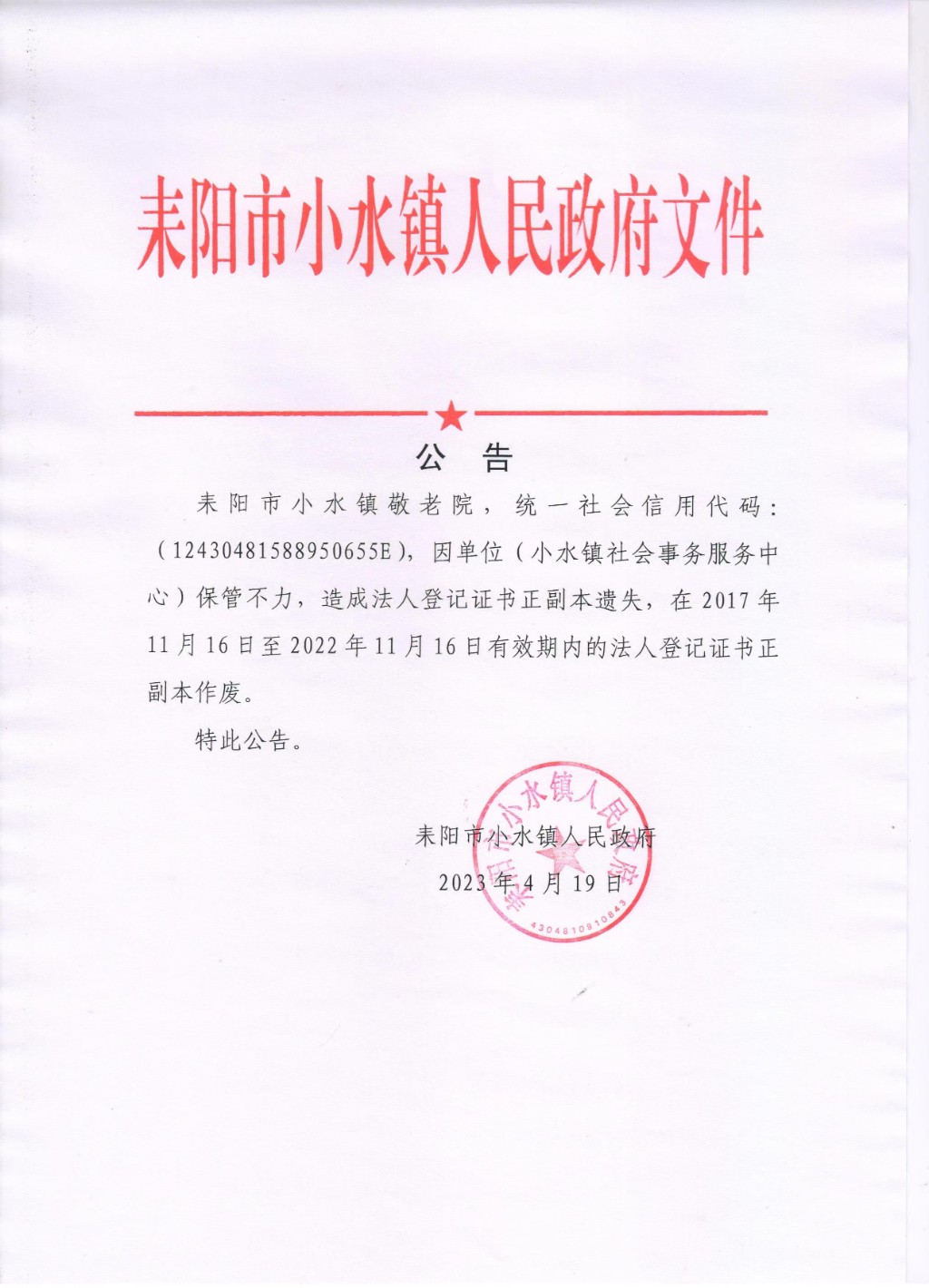 耒阳市小水镇敬老院法人登记证书遗失宣布作废