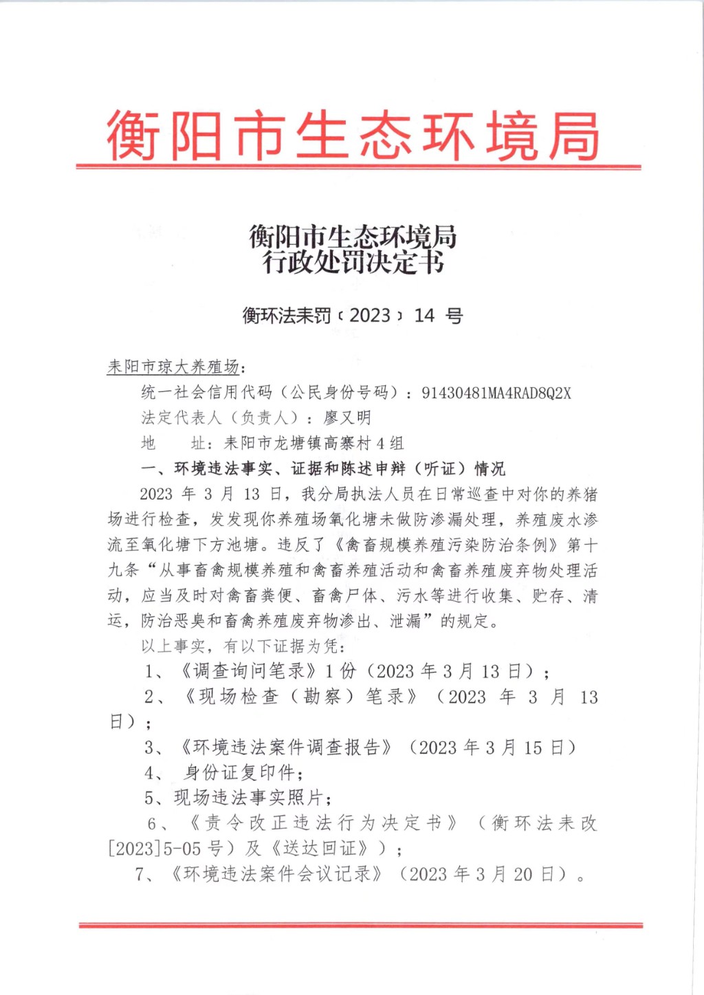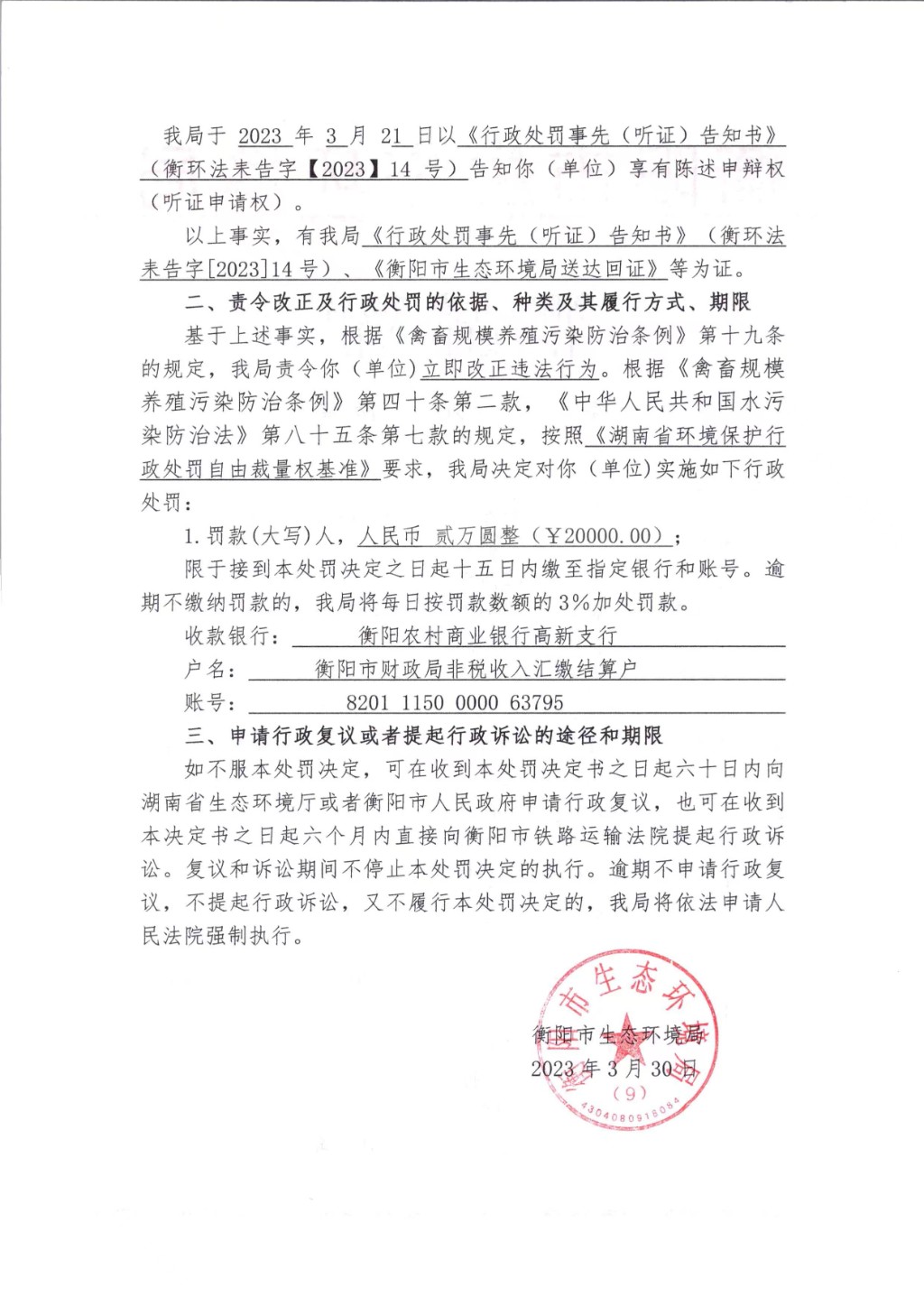 衡阳市生态环境局行政处罚决定书 衡环法耒罚[2023]14号