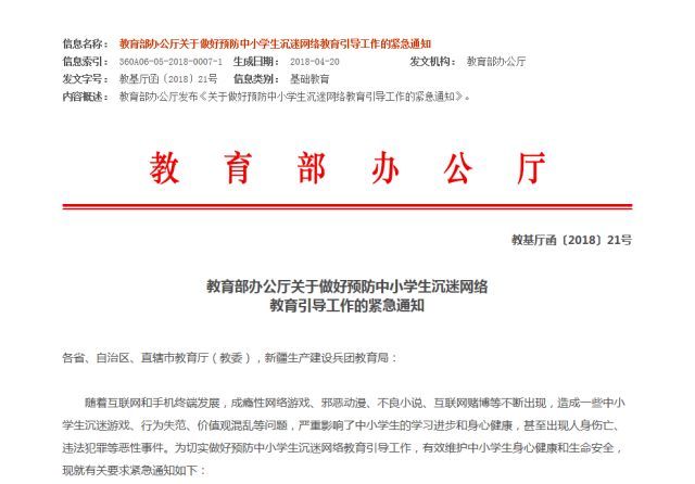 教育部印发《关于做好预防中小学生沉迷网络教育引导工作的紧急通知》