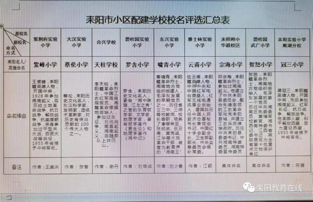 1.“紫荆府实验小学(暂名)”拟命名为“紫峰小学”,最早投稿人王美洪,收件时间:2021年10月31日13时13分;地处新城一路和西湖北路交汇处。命名缘由:王紫峰,耒阳籍英雄人物,开国中将,1928年参加湘南起义,后历经土地革命战争、抗日战争、解放战争、抗美援朝战争,亲身参加过平型关大战、百团大战等战役,1955年被授予中将军衔。2.“大汉实验小学(暂名)”拟命名为“蔡伦小学”,最早投稿人贺智,收件时间:2021年10月23日23时11分;地处环城西路和新城二路交汇处。命名缘由:蔡伦,耒阳历史文化名人,东汉科学家、发明家,造纸术革新家,对历史有突出贡献的100个伟大人物之一。3.“合兴实验学校(暂名)”拟命名为“天柱学校”,最早投稿人谢丹,收件时间:2021年10月22日10时28分;地处新城二路东头。命名缘由:李天柱,耒阳籍革命烈士,中国工农红军高级指挥员、湘赣革命根据地创始人,参加过东征、北伐战争、南昌起义、湘南起义,后随部队上井冈山。4.“碧桂园实验小学(暂名)”拟命名为“罗含小学”,最早投稿人刘培战,收件时间:2021年10月28日16时33分;地处梅桥居委会高速联络线旁。命名缘由:罗含,耒阳历史文化名人,素有“湘中琳琅、江左之秀”之誉的东晋哲学家、文学家、地理学家,著有哲学著作《更生论》和地理学著作《湘中记》。5.“东兴实验小学(暂名)”拟命名为“啸青小学”,最早投稿人刘小香,收件时间:2021年10月24日12时32分;地处东江街道东鹿居委会。命名缘由:蒋啸青,耒阳籍革命烈士,湘南地方党组织创建人,毛泽东发展的早期党员之一,历任省立三中、三师等校教师、校长等职,教育引导了像曾希圣、张经武、伍云甫、黄克诚、江华等一大批革命干部,被誉为教育界的“湘南王”。6.“雅士林实验小学(暂名)”拟命名为“云甫小学”,最早投稿人江颖,收件时间:2021年10月28日8时58分;地处青麓居委会东二路东侧。命名缘由:伍云甫,耒阳籍英雄人物,中共中央和中国红军电台奠基人,红军无线电通讯事业创始人,中华人民共和国成立后历任中国人民救济总署秘书长兼党组书记、中国红十字会副会长、卫生部副部长、中央监察委员会候补常委。7.“耒师附小华毅校区(暂名)”拟命名为“宗海小学”,集体研究命名;地处水东江街道铜锣洲。命名缘由:邓宗海,耒阳籍革命烈士,参加过湘南起义。他建立了中共耒阳县委员会,配合朱德率领的工农革命军攻克耒阳县城,并建立工农兵苏维埃政府。历任中共耒阳县县委书记、中共湘南特委委员、湘南特委宣传委员。8.“碧桂园武广小学(暂名)”拟命名为“贺恕小学”,集体研究命名;地处武广新城武园路与武二路交汇处。命名缘由:贺恕,耒阳籍革命烈士,湘南地方党组织创始人,毛泽东发展的第一个党员,历任中共湘南区执委委员、黄埔军校教官、湘西南特委书记、江西省委书记,太平圩乡寿州村贺恕故居为全省第十批重点文物保护单位。9.“耒阳实验小学顺湖分校(暂名)”拟命名为“冠三小学”,最早投稿人符健,收件时间:2021年10月26日16时27分;地处武广新城余庆大道、武二路、厚德路交汇处。命名缘由:谭冠三,耒阳籍英雄人物,开国中将,先后参加湘南起义、红军长征、抗日战争、解放战争。他率部入藏,和平解放西藏,致力建设西藏,1955年被授予中将军衔。按征集公告有关规定,本次征集活动中最终采用的校名,其著作权及其他权利均归耒阳市教育局所有;被采用校名按每命名一校400元标准予以奖励。