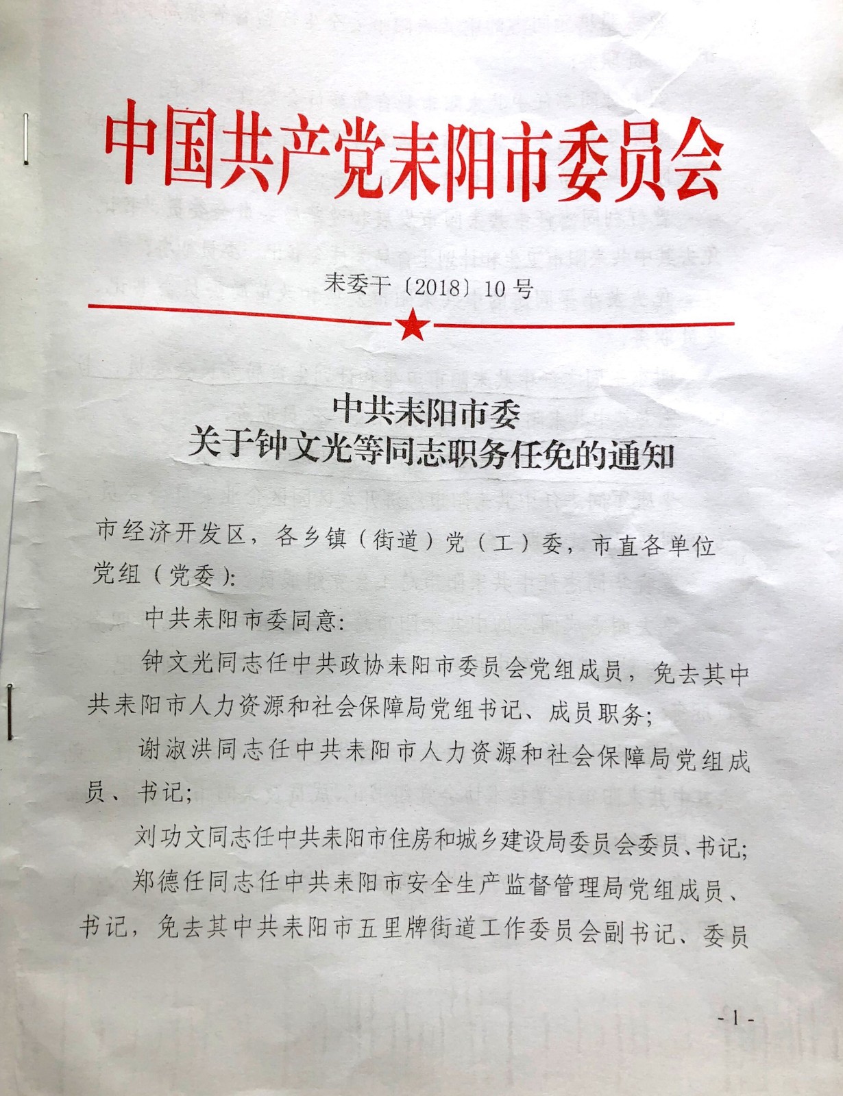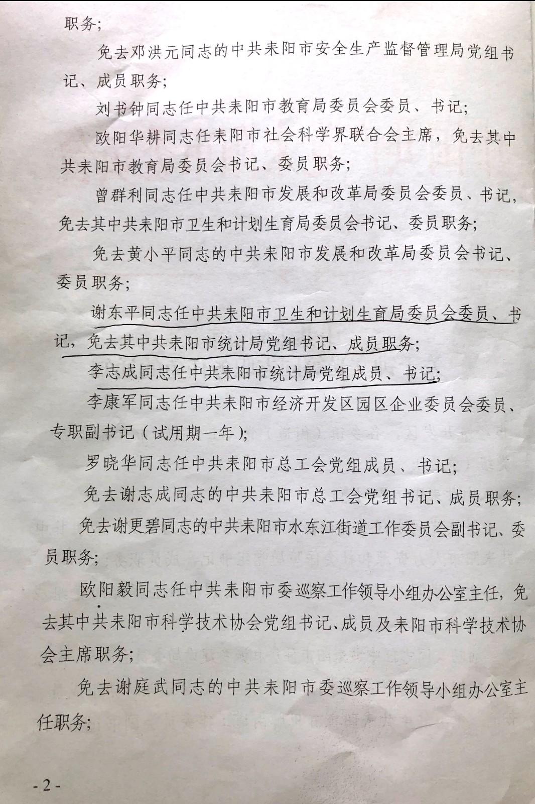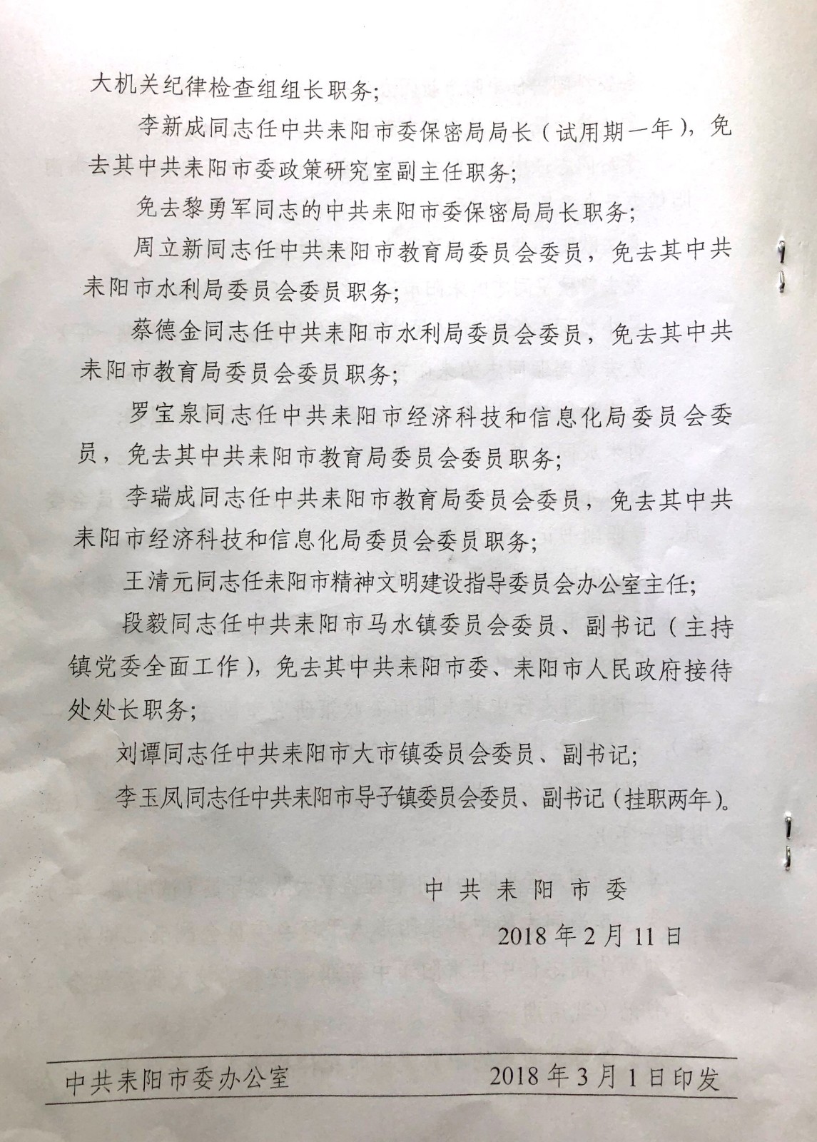中共耒阳市委关于李志成等同志职务任免的同志