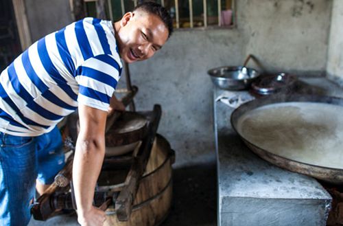完成这两道制糖前的准备工序后,下面就开始真正进入做糖环节了。我们姑且将这一步叫制糖糟吧。先一天下午两点左右,称优质大米二十六斤,将其浸泡三个小时,待米粒完全吸水后,将大米用石磨磨碎,磨碾的力度必须掌握好,不能太细也不能太粗,像小米大小最佳。如今这道工序不再用石磨了,取而代之的是机器了,机器毕竟省时省力,而且更能控制精准度。