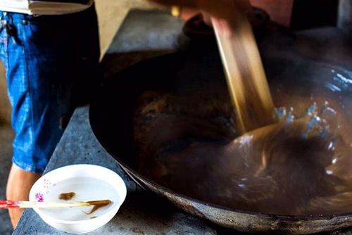 生起一灶火,将磨好的米入锅煮透。火候在此时是关键,不能用大火,否则米会粘锅;火太小,米又不会熟。而且此时得用大铁铲连续不停的反复搅拌两个小时,待大米熟透后,加入四两谷芽,小火熬制,慢慢搅拌半个小时,此时谷芽和大米已变为了无任何味道的“斋糖糟”。再加入四两谷芽,文火熬制半小时,直至铁铲从锅里慢慢抽出时,米不粘铁铲,就说明大米中的糖分已分离出来。这时可将糖糟舀出放入大木桶让其自然冷却至60度左右,再加入七两谷芽,充分搅拌,让它与糖糟完全融合,发生微妙的化学反应。此时糖水完全渗出。然后待糖糟自然冷却至55度后,将其舀入锅旁的陶缸中,让其发酵一晚,待第二天制糖使用。我问小廖,为什么是55度呢。他诡秘的一笑,说,这是他多年摸索出来的经验,别的制糖人都不知道。温度低于55度,第二天制成的成品糖味道会变酸,甜中带酸,影响口感;若温度过高,谷芽就会被烧坏,引不出糖来。看来小伙子还真的有一手啊!悟性高!难怪当初他姑父肯将这套传内不传外的制糖技艺传授给他!