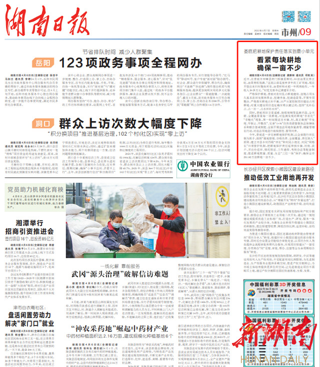 今年,娄底进一步完善耕地保护机制,以全面推行田长制为抓手,按照"属地管理、分级负责、全面覆盖、责任到人"原则,建立市县乡村四级"田长"和村民小组长、村民"网格长"日常管护机制,把耕地保护责任延伸到乡镇、村组、农户,并出台巡田、情况报送、工作通报、考核办法等配套制度,推进耕地数量、质量、生态"三位一体"保护,确保全市251.82万亩耕地一亩不少。
