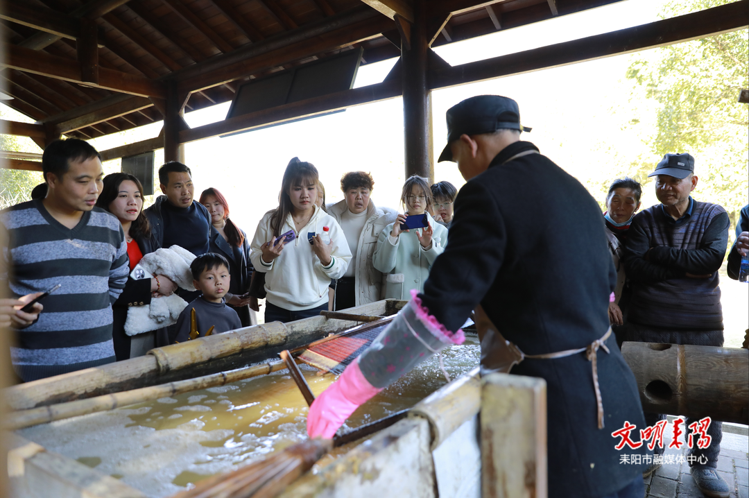 蔡伦故里,“一纸”名扬千里!在国家级4A景区蔡伦竹海,游客们除了来此欣赏16万亩连片竹海的美景外,还亲身体验蔡伦古法造纸技艺,感受国家非遗文化魅力。景区中央的造纸工坊,非遗传承人现场演示抄纸的过程,熟练地将抄好的纸浆叠放在一块木板上,等待晾干分离成纸张。“太有智慧了!造纸术就是人类智慧的结晶,是人类伟大的发明和创造!”游客张先生惊叹道,并拿起刚出品的“手工纸”,一边笑着拍照发圈,一边说:“这张纸我要带回家,留作纪念。”