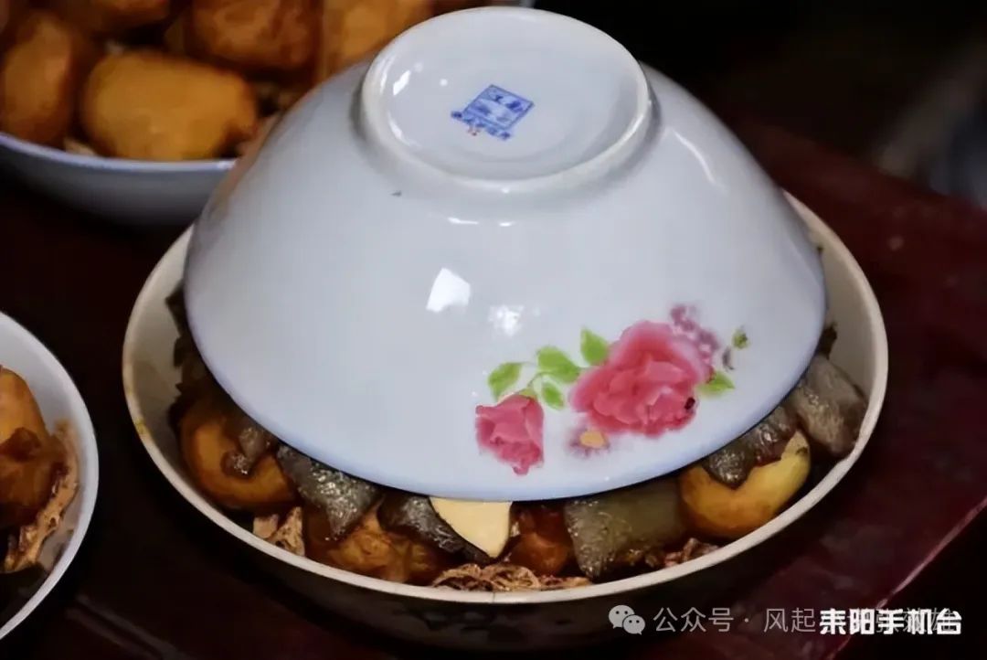 主菜有道"敬菜碗",也就是"扣肉"。一般为第五、六道菜,所谓"酒过三巡菜上五品",就是这个讲究。这道菜上桌之前,按旧时的例规,要烧纸上香敬老爷。婚宴上,家主会领着新郎逐席行礼;寿宴上,寿星与长子逐席敬酒。上这道菜时,伙计加酒,新郎或长子揭开扣肉碗盖,请客人品尝。如今的习俗,还要敬纸烟。如果是白喜事,孝子要逐席下跪行大礼,众人起身扶孝子称"孝子高升"。孝子也要揭碗。故肉碗又称"敬菜碗",是向宾客表示感谢和致敬之意。