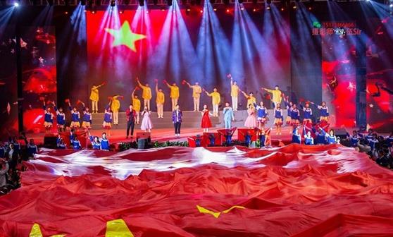 “我和我的祖国,一刻也不能分割。无论我走到哪里,都流出一首赞歌……”当熟悉的旋律响起,现场每一位观众中都涌动着豪情!晚上七点半,合着一首《我和我的祖国》的歌曲,现场观众挥动手中小国旗,群众演员组成的方阵在现场中央铺开巨型红旗,还有身穿红色T恤的队列纵横穿插其间,台上台下互动暖场,气氛迅速聚焦在一起。紧接着,播放耒阳旅游宣传片。然后,由耒阳市一中师生和各乡镇代表带来的大型歌舞《在希望的田野上》拉开了演出序幕。
