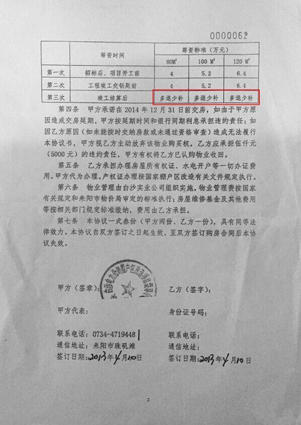 关于启动购房户第二次交款,该负责人告诉记者,2011年项目(业主)单位征求住户购房意向,收取了1-3万元的认购住户定金;2013年启动第一次交款并签订了《白沙佳苑物业认购意向协议书》,按80、100、120三种户型收取了4万、5.2万和6.4万元(含订金)的50%房款资金;今年5月30日召开的联平新城项目建设领导小组第八次会议,会议决定,80平方米、100平方米、120平方米住宅分别暂按每套4万元、5万元、6万元预收,最迟应在7月31日前完成交款工作。再视工程进度和资金情况由项目建设领导小组决定下一次收款时间和方式。 对此,购房户不理解。