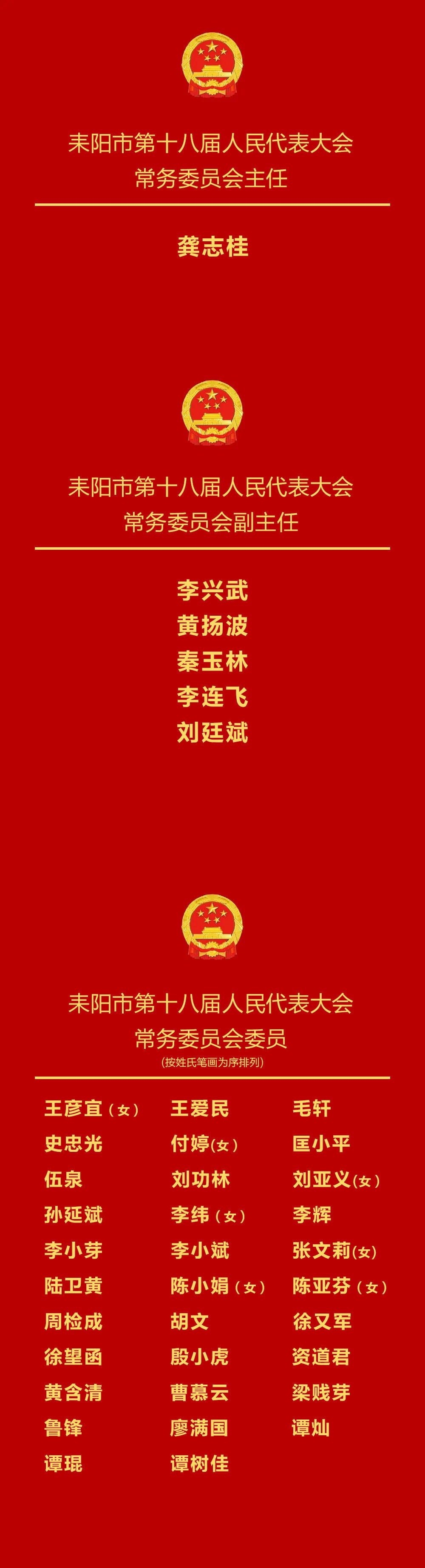10月29日,耒阳市第十八届人民代表大会第一次会议举行第三次全体会议,选举了耒阳市第十八届人民代表大会常务委员会主任、副主任、委员,名单如下: