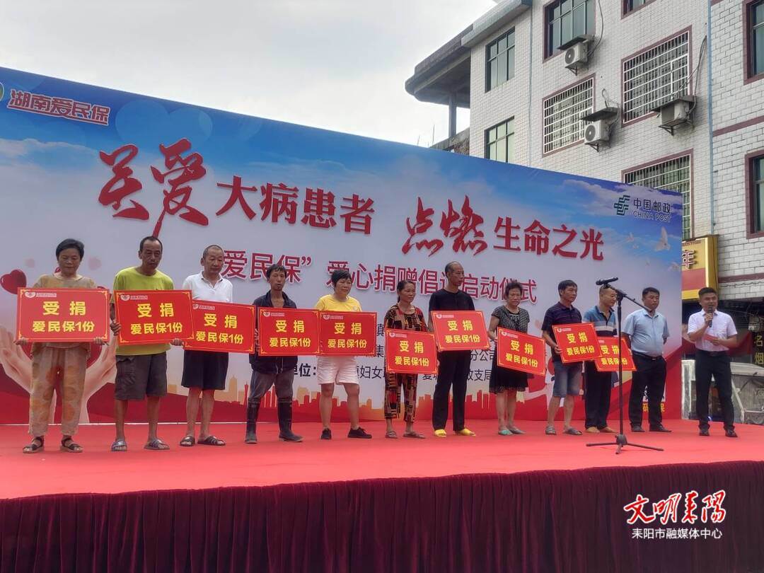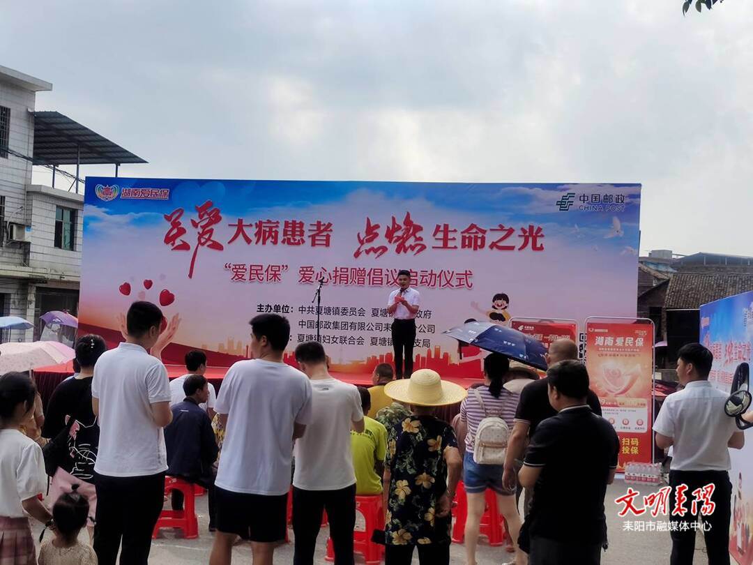 8月13日,中国邮政耒阳分公司联合夏塘镇举行"关爱大病患者·点燃生命之光""爱民保"爱心捐赠启动仪式,来自夏塘镇的爱心人士和爱心企业为群众捐赠了150份"爱民保"。