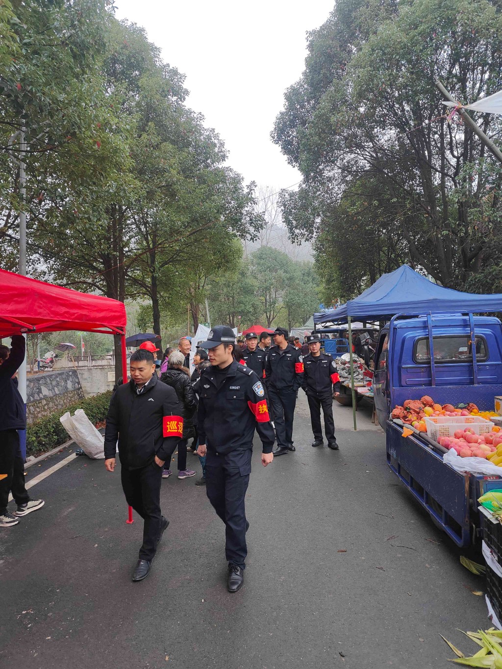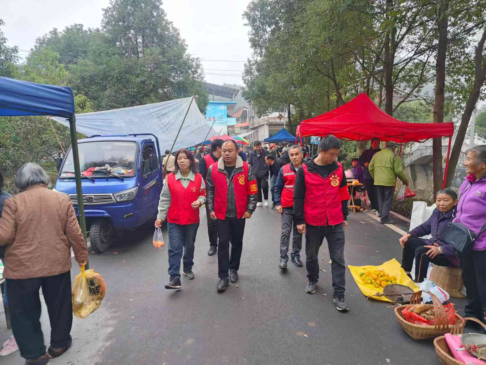 在现场,工作人员统一佩戴袖章,对圩场的各个区域展开巡逻工作,时刻保持警惕,留意着人员密集处的动态。同时,与摊主、群众进行亲切交流,及时调解可能出现的矛盾纠纷,确保圩场氛围和谐融洽。