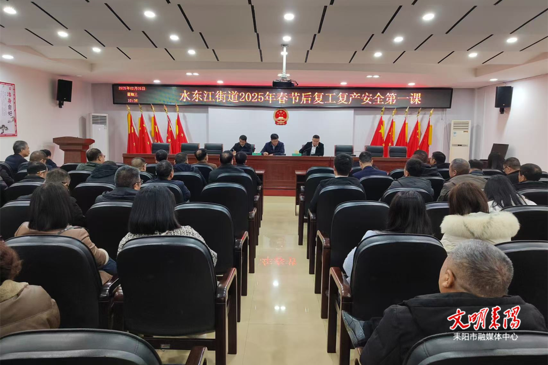 为贯彻落实复工复产"六个一"工作措施,水东江街道办事处组织辖区部分企业负责人、在建重点项目施工方、村(社区)安全员进行复工复产专题培训,开展"开工第一课讲安全"活动。此次培训内容涵盖各行各业安全生产知识。通过带领大家学习复工复产注意事项,督促其收好心、尽好责、站好岗。同时,着重强调各安全责任主体必须要压实自身责任,持续以高警觉、重泰山的安全意识确保辖区平安。