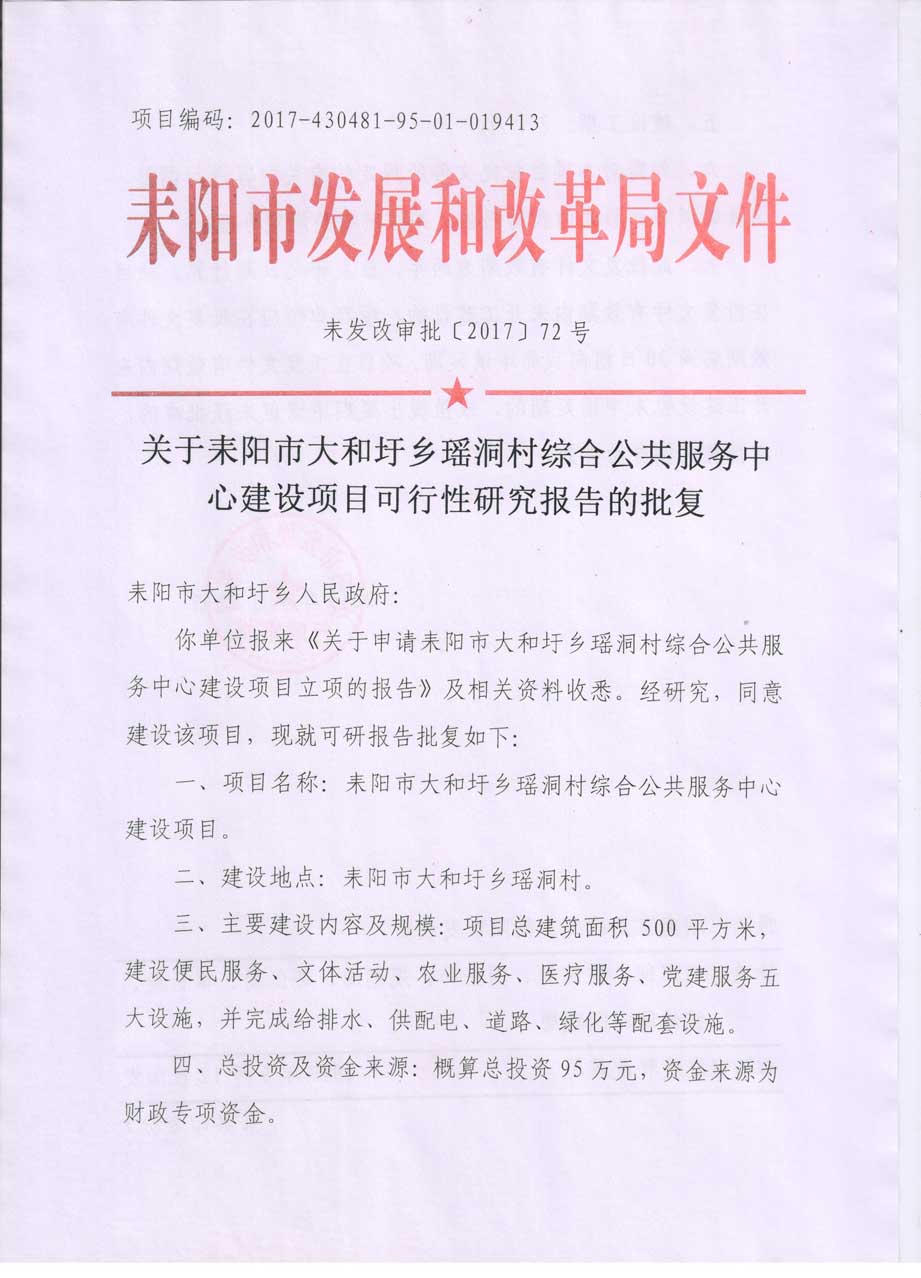 关于耒阳市大和圩乡瑶洞村综合公共服务中心建设项目可行性研究报告的批复
